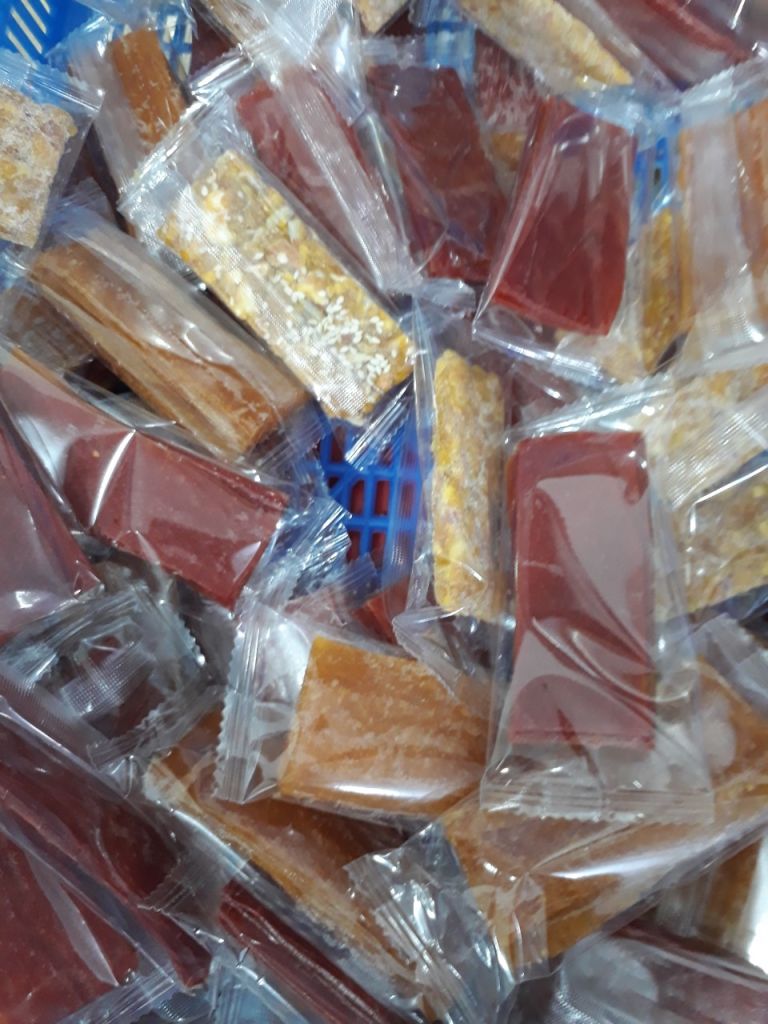 Mango leather and other fruit leathers are cut and packed in convenient plastic wrap