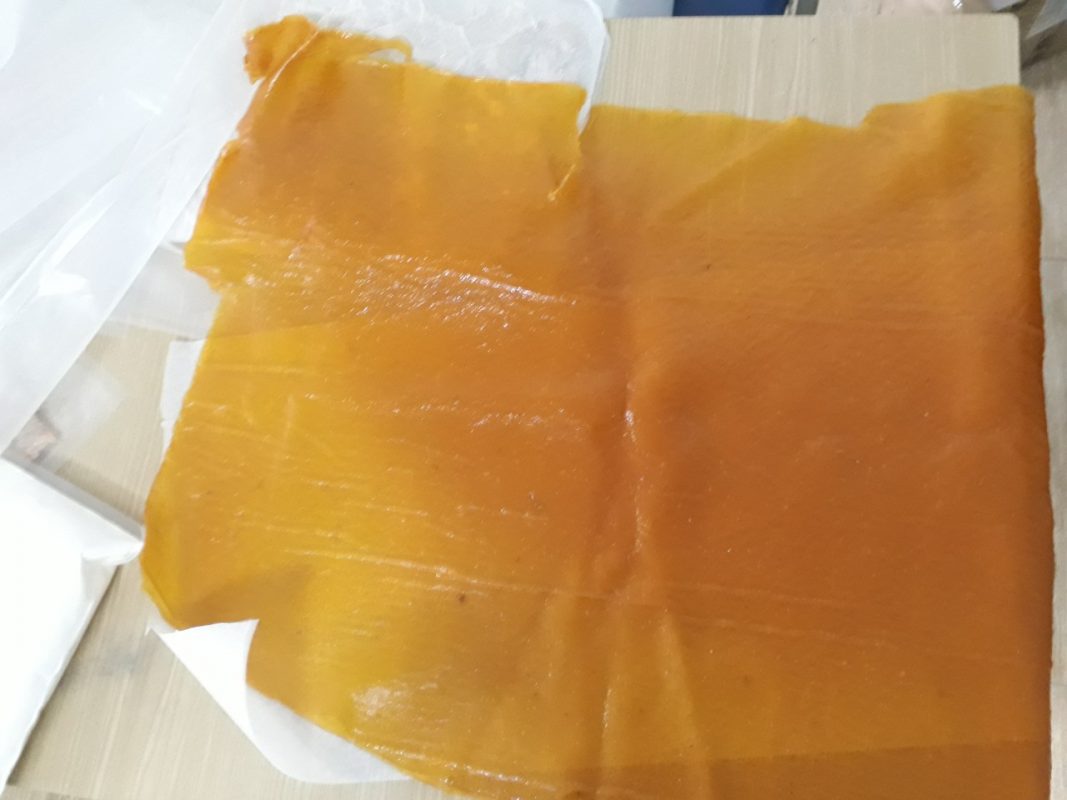 The fruit leather sheet can be cut into different sizes and then can packed in different types of packages. The mango fruit leather can be also chopped into small pieces for certain application like to be included in yogurt, cookies, cake filling, smoothies and so on.